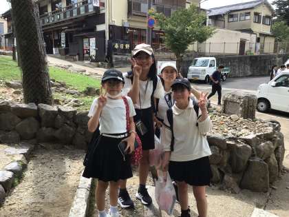 雨に降られることなく奈良公園班別行動を終え、11時10分ごろ三笠観光会館駐車場に集合しました。時折り晴れ間もみられ、大変暑い中で歩き回っての見学となりました。この後、途中で昼食を食べてから、次の法隆寺に向かいます。