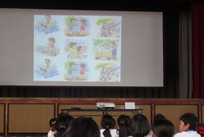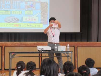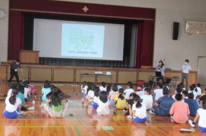 9月20日(水)第2・3校時体育館にて、豊田市上下水道局より2名の講師の方をお招きし、4年生上水道出前授業を行いました。水道の始まりと矢作川、浄水場の仕組み、配水場についてなどを学びました。