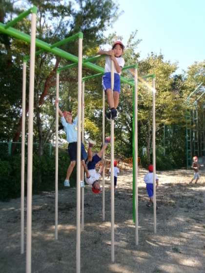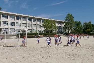 9月25日(月)午前10時40分ごろの運動場の様子です。たくさんの児童が、サッカーやバスケットボールをして遊んでいます。雲梯や登り棒、ジャングルジムやブランコなどの遊具でも遊んでいます。