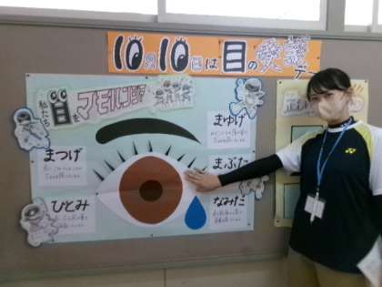 先週から「学校体験活動」で来校している愛知教育大学の学生が、保健室前の掲示物「目の愛護デー」を作成してくれました。まゆ毛やまつ毛などの役割や電子機器を使うときの注意、正しい距離を、とてもわかりやすく、楽しいイラスト入りで工夫して作ってくれました。スマホは30cm離して使う、テレビからは2m離れて見るなど、大切な目を守るために、意識して使うようにしましょうね。