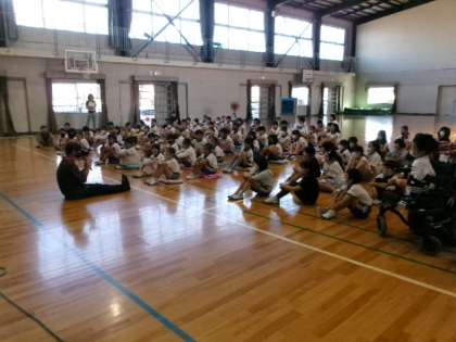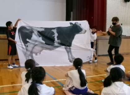 9月29日(金)第1校時体育館にて、元酪農家の久保田健一さんを講師にお招きし、4年生対象の保健集会「いのちをいただく」を実施しました。乳牛の実物大のシートを使った説明や様々なエピソードをお話しいただく中で、家畜の命をいただいている有難さや、命の大切さを再確認することができました。