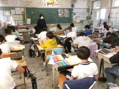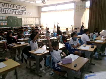 第2校時の様子の続きです。1枚目は、4年生の算数「式と計算の順じょ」です。多くの児童が進んで挙手し、活発に意見を発表し合っていました。2枚目は、5年生の図工「読書感想画『フランクリンの空とぶ本屋さん』」です。描きたい場面を決め、丁寧に下絵を描いていました。3枚目は、6年生の理科「月の形はなぜ変わって見えるか考えよう」です。月に見立てた球体の模型にライトの光を当てながら、活発な話し合いが行われていました。