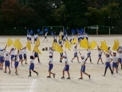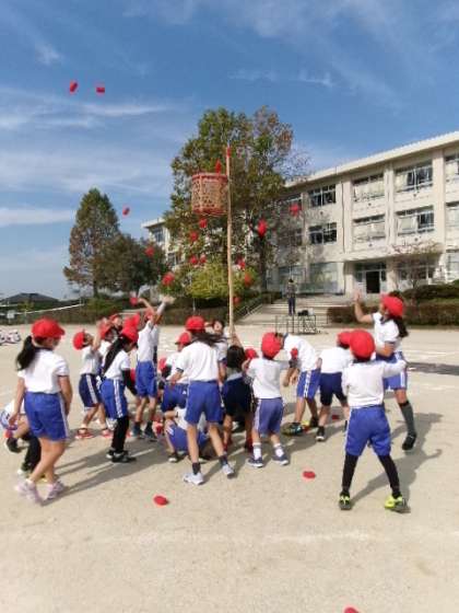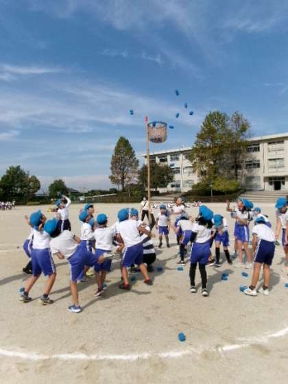 10月25日(水)第2校時、3・4年生の合同練習がありました。1・2枚目は「みんなDE玉入れ」です。なかなか入りませんが、クラスごとで競い合い、とても楽しそうです。3枚目はフラッグ「ケセラセラ!!」の様子です。隊形移動も上手になり、だんだんと仕上がってきましたね。あと3日、もう少しで本番です。ラストスパートですね。