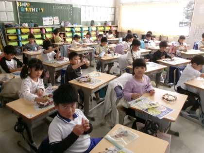 10月31日(火)第4校時教室にて、1年生が生活科「あきとあそぼう」で集めた素材を使って「リースつくり」をしました。ドングリや落ち葉をボンドでつけて、きれいにリースを飾っています。素敵な作品ができそうです。