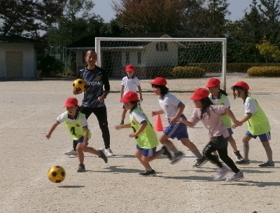 準備運動の後、ボール操作やドリブルの練習をしました。ゲーム形式の練習では、ナイスプレーが続出していました。