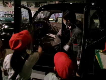 和服でも乗り込みやすい観音開きのドアや、馬などの動物を刺激しないラッパ型のクラクションなど、本物を見ながら貴重な体験学習をすることができました。