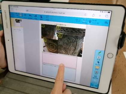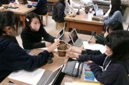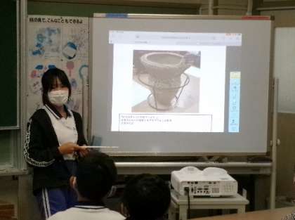 それぞれが気に入った縄文土器のテーブルに集まり、タブレットで写真を撮って印象をまとめ発表しました。児童それぞれが、想像力を働かせたユニークな名前を付けていました。歴史を身近に感じることのできる楽しい実践となりました。