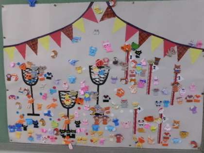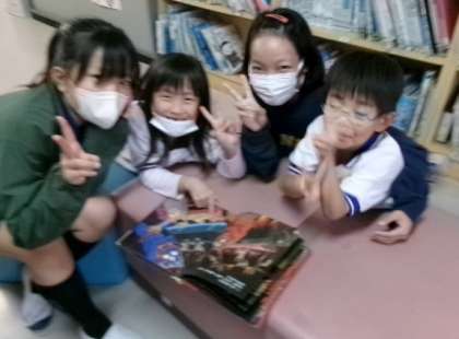 秋の読書週間の続きです。1枚目の写真は、11月10日(金)なかよしタイムの図書室の様子です。借りる人と返す人、たくさんの人でごった返しています。2枚目の写真は。6年生と1年生が一緒に本を読んでいるところです。3枚目の写真は、ゆりのきボランティアさんによる掲示物です。司書さんのいる毎週火曜日に1冊借りると、かわいい動物の折り紙を貼ることができます。