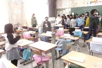 第3校時5年生の1クラスは、ALTの先生との英語の授業でした。教室の各自の机を建物に見立て、英語で道案内をするといった授業でした。「Go straight for two blocks,Turn left.」などの声がたくさん聞こえました。どの児童も楽しく取り組み、実践的な学習をすることができました。