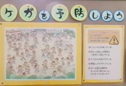保健室前廊下の掲示の紹介です。1枚目は「ケガを予防しよう」です。絵の中の危険を探すクイズになっています。2枚目は「くつひも結び練習ひも」です。くつひもが解けてしまわないよう、しっかりと締められるように練習しましょう。