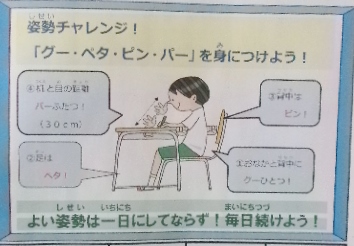 3枚目は、保健だよりの一部です。11月の目標は「姿勢を正そう」です。よい姿勢は一日にしてならず、「グー・ペタ・ピン・パー」の合言葉を、毎日守っていきましょうね。
