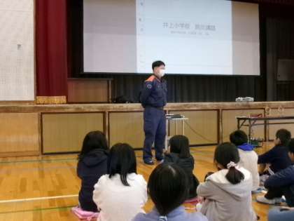 11月22日(水)第1・2校時体育館にて、豊田市消防本部北消防署より1名の講師をお招きし、5年生対象の防災講話をしていただきました。地震や水害について、大変細かく丁寧にお話しいただき、防災クイズでたくさんの知識を身につけることができました。「守るぞ命 井上小サバイバル5」と題して、災害に備えて、自分たちに何ができるかを考えるとてもよい機会となりました。
