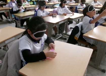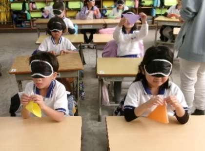 はじめに、1年生は視覚障害者センターつえの里から、2名の講師の方をお招きし「アイマスク体験」を行いました。白杖のお話を聞いたり、アイマスクをしたまま折り紙を折ったりするなどの体験をしました。