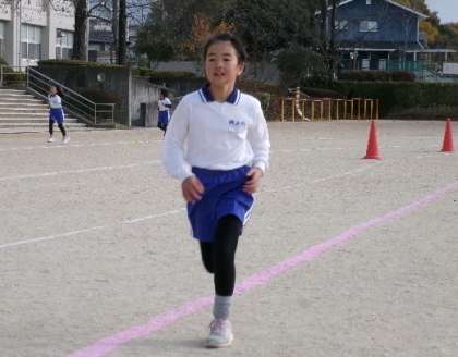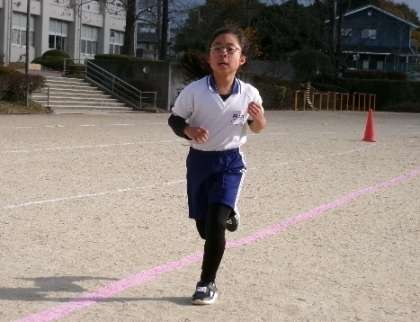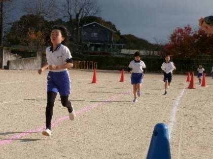 11月30日(木)第1・2校時運動場にて、3・4年生の持久走試走会を行いました。距離はトラック3周半、約1000mです。今回も、3年女子・3年男子・4年女子・4年男子の順番に紹介します。はじめに、3年女子のゴール寸前の様子です。