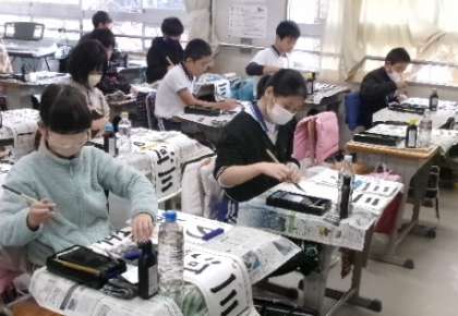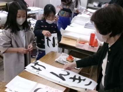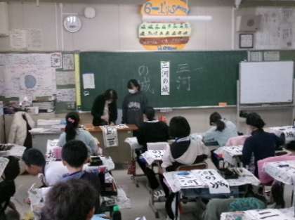 11月30日(木)第1〜4校時、6年生と3年生が、書き初めの「三河の城」と「げんき」の指導を、書写ボランティアの先生からしていただきました。細かなところまで、しっかりと教えていただきました。