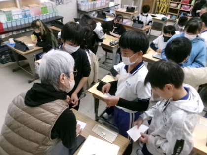 自分の名前を点字で書き、どの子も講師の方に読んでもらうことができました。大変わかりやすいお話で、興味関心が高まり、「またやってみたい」と言っている児童もいました。