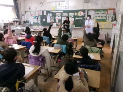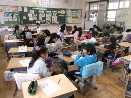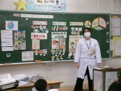 12月5日(火)第4校時外部から講師の方をお招きし、3年生の1クラスが、食に関する授業「3つのグループの食品をバランスよく食べよう」を行いました。