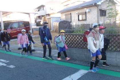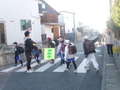 12月6日(水)朝8時ごろの井上地区の通学の様子です。PTAの活動として、保護者が横断歩道で黄色の旗をもって見守ってくださっています。年末の交通安全市民運動中は、教員も分担して立哨指導をしています。