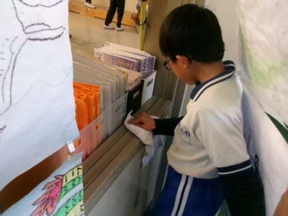 12月6日(水)午後1時30分ごろ、掃除の時間の様子です。今日清掃強調週間2日目の重点場所は、「窓のさん」や「出入り口のレール」などでした。清掃終了後、教室に環境委員がやってきて、チェック表に〇や△などをつけていました。皆で協力して、すみずみまできれいにしていきましょうね。