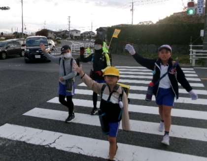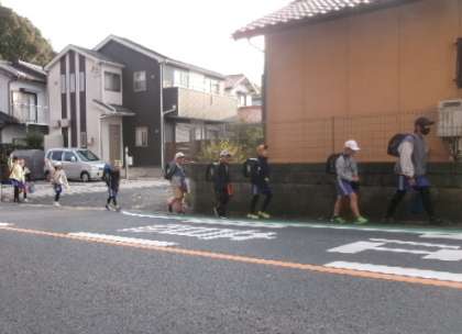 12月7日(木)御船地区児童の登校の様子です。中には、30分以上かけて長い距離を歩く班もあります。歩道のない場所もありますが、1列になって安全に歩きます。横断歩道などの交差点では、しっかりと手を挙げて横断しています。