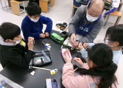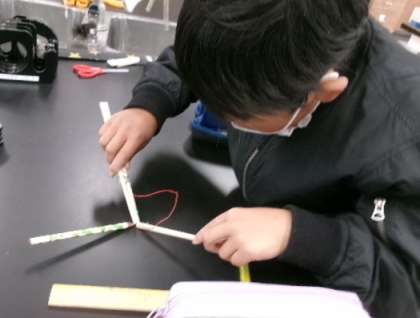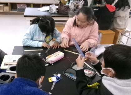 3年生「ものづくり」2日目の続きです。理科室では「LEDテスターをつくろう」の授業でした。割りばしとLED、ボタン電池でテスターを作り、様々なもので、電気が通るか通らないかを調べました。とても楽しく貴重な体験をすることができました。ものづくりサポーターの皆さん、本当にありがとうございました。