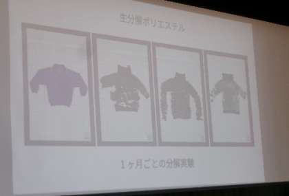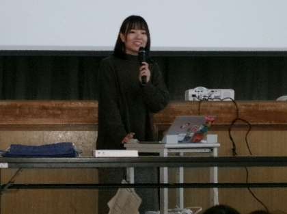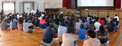 12月18日(月)第4校時体育館にて、大学から2名の講師をお招きし、家庭科の出前授業「思いを形にして生活を豊かに」を行いました。「土に還るポリエステル」を使って、巾着袋を作るという内容です。