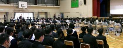 12月20日(水)午前中、6年生が井郷中に出かけ、井郷中1年生との交流活動をしました。各教室や運動場で、中学校の授業を参観した後、体育館で、中学1年それぞれの学級の企画による交流会を行いました。