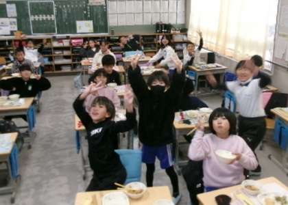 12月20日(水)4年生の給食の様子です。献立は、磯香あえ・豆腐しんじょ・肉じゃが・ごはん・牛乳でした。みんな笑顔で、とても楽しそうですね。