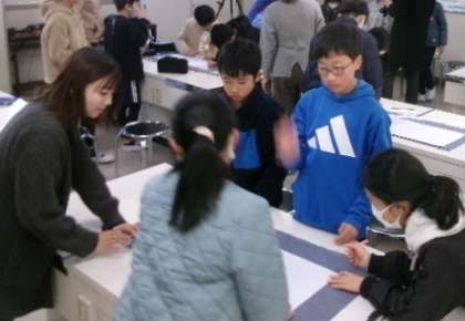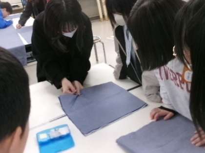 12月21日(木)第1・2校時家庭科室にて、大学から3名の講師をお招きし、家庭科「思いを形にして生活を豊かに」(土に還る巾着袋づくり)の授業をしました。今日は裁断までで、今後ミシン縫いへと進む予定です。素敵な巾着袋ができそうですね。