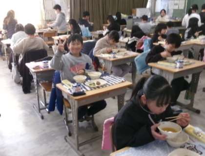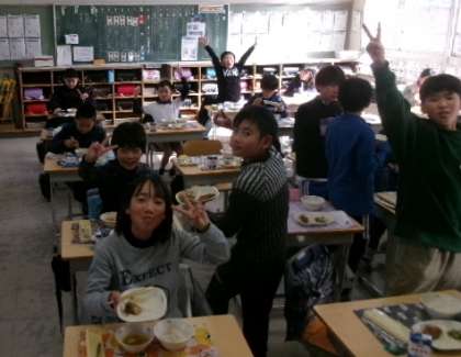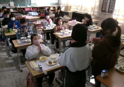 12月21日(木)5年生の給食の様子です。献立は冬至献立で、はくさいのごまあえ・ぶりのゆず風味揚げ・かぼちゃのみそ汁・ごはん・牛乳でした。静かに早く配膳の準備をして、楽しく落ち着いて食べていました。