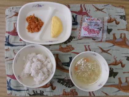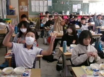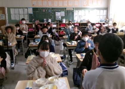 12月22日(金)6年生の給食の様子です。今日の献立はクルスマス献立で、パスタスープ・チキンライス(麦ごはん)・オムレツ・ガトーショコラ・牛乳でした。楽しみにしていたガトーショコラは、とっても甘くておいしかったですね。