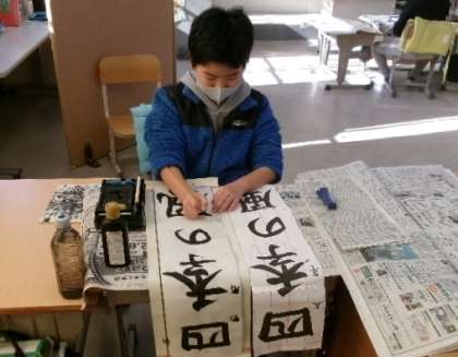 書き初め大会の続きです。校内書き初め展を、1月15日(月)〜18日(木)午前9時から午後4時30分まで(18日最終日は午後3時30分まで)、体育館で開催します。駐車場は、運動場南側です。ご来校をお待ちしております。