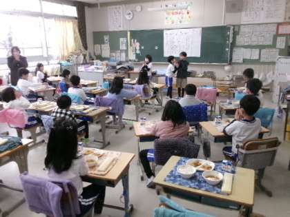 1月10日(水)2年生の給食の様子です。献立は、かしわ汁・煮あえ・にぎすフライ(ウスターソース)・ごはん・牛乳でした。1月の誕生日の子のお祝いをしていたクラスもありました。みんなで「いただきます」をしてから、おいしくいただきました。