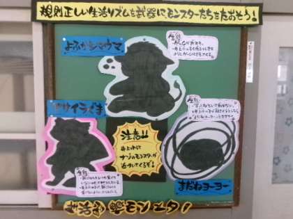来週の月曜日1月15日から、保健委員会による「生活習慣モンスターをたおそう」の取組が始まります。10月に実施した「健康アップへのみち」の結果を受け、「早寝・早起き・朝ごはん」の習慣づけが目的の取組です。ご家庭のご理解とご協力を、よろしくお願いいたします。