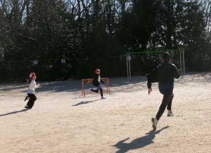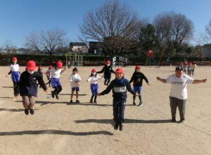 1月17日(水)午後1時45分ごろ、なかよしタイムの運動場の様子です。暖かい日差しの中、なわとびをする児童が多くなってきました。また、鬼ごっこをする児童も多く、今日は3人の先生も参加していました。冬でも、できるだけ運動できるといいですね。