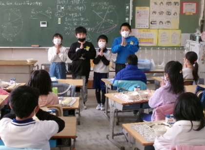 1月22日(月)3年生の給食の様子です。今日の献立は、ひじきの炒め煮・つくね汁・いわしの梅煮・ごはん・牛乳でした。全員でアレルギーの確認をした後、「いただきます」のあいさつをしてから、おいしくいただきました。