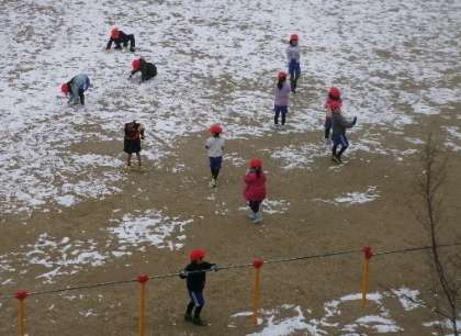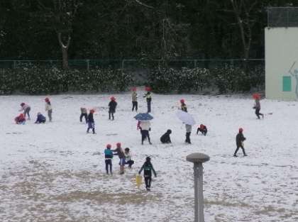 雪遊びの続きです。今日の雪は、なかなか溶けません。一日中降っていますね。