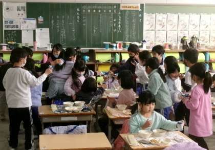 1月26日(金)1年生の給食の様子です。誕生日が近い子のお祝いとして、牛乳で乾杯をしているクラスもありました。