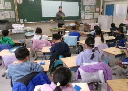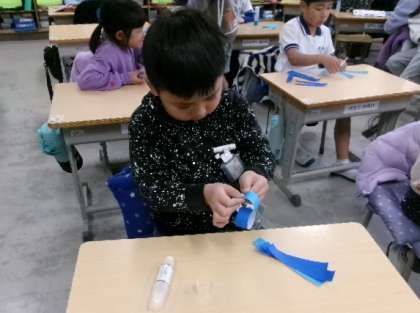 1月31日(水)第2校時、1年生が折り紙で、チューリップや輪の飾りを作っていました。このように、日本人は、小さいころから細かな作業も丁寧に頑張るので、手先が器用になっていくのでしょうね。