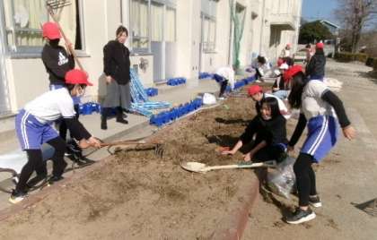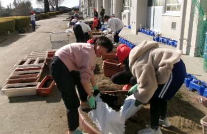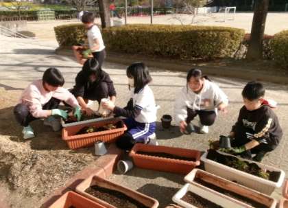 卒業プロジェクトの続きです。校舎南側では、6年生が「花壇の整備(プランターへの花の植え替え)」をしていました。こちらについても、これから随時お知らせしていきます。
