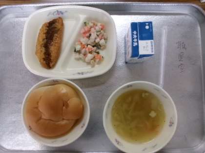 今日も6年生とのランチ会をしました。献立は、ビーンズマセドアン・サーモンフライ・大麦と野菜のスープ・りんごパン・牛乳でした。りんごパンが人気でした。