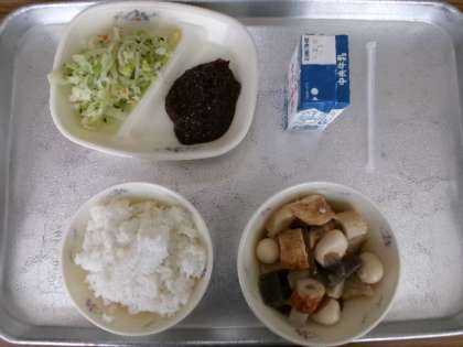 今日も6年生とのランチ会をしました。今日の献立は「たべまるのおすすめ献立」で、青菜あえ・肉みそ・おでん・ごはん・牛乳でした。10周年記念誌に、お父さんの名前を見つけた児童もいました。