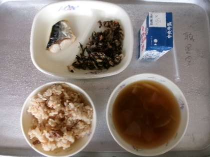 今日も6年生とのランチ会をしました。今日の献立は、ひじきの炒め煮・さばの塩焼き・のっぺい汁・三河赤鶏五目ごはん・牛乳でした。楽しい思い出の話もありました。