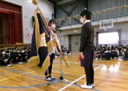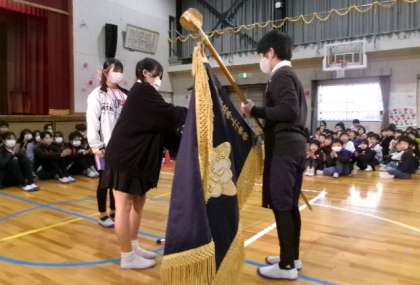「思い出のビデオ」はとても懐かしい映像でした。「校旗の引継ぎ」を行い、伝統を引き継ぐ自覚をもちました。