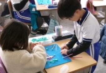 2月29日(木)第1校時2年生の算数の授業です。数え棒とねんど玉で、はこの形を作っています。何本の数え棒と何個のねんど玉がいるのかな。