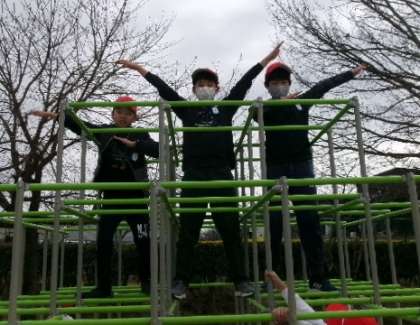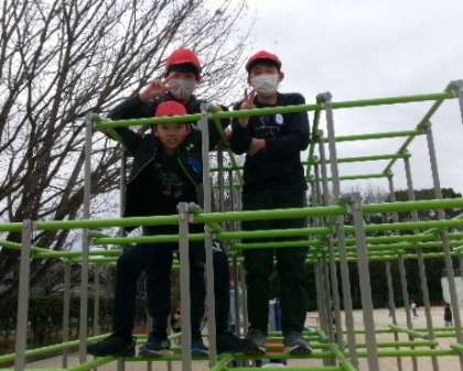 第2校時後のふれあいタイムに、突然、ジャングルジム3人組が現れました。ナイスポーズです。