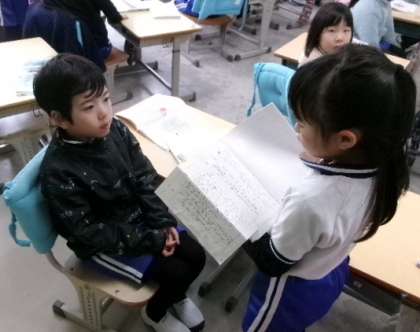 3月4日(月)第2校時、1年生の国語「小学校のことをしょうかいしよう」の様子です。しせいはピン、こえは大きく、かおはにこにこ、口はあいうえおを意識して、緊張感をもって練習していました。