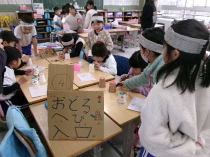 第3校時2年生教室と家庭科室で1・2年生が、交流活動「おもちゃまつり」を行いました。2年生が作ったおもちゃを1年生に遊んでもらうといった内容です。