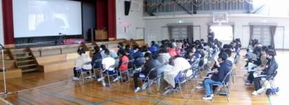 3月6日(水)第3校時6年生が体育館で、「WAKU IKI 大人図鑑」10人目の方からのお話を、オンラインで聞きました。今日のゲストは、石川県珠洲町で個人事業主としてカフェやバー、ホテルなどを運営している方でした。