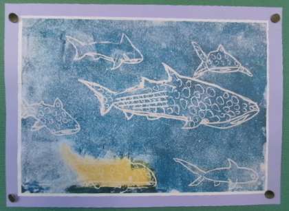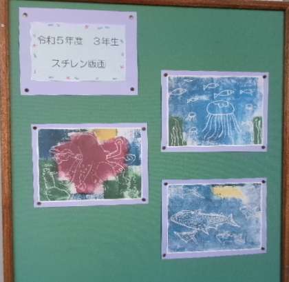 図工室前には、3年生のスチレン版画が掲示されています。すてきな作品ばかりですね。